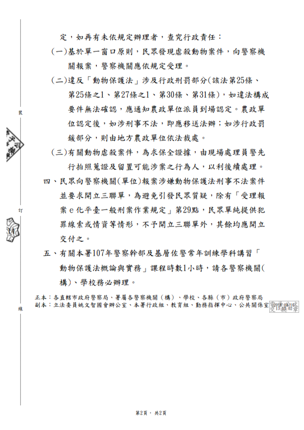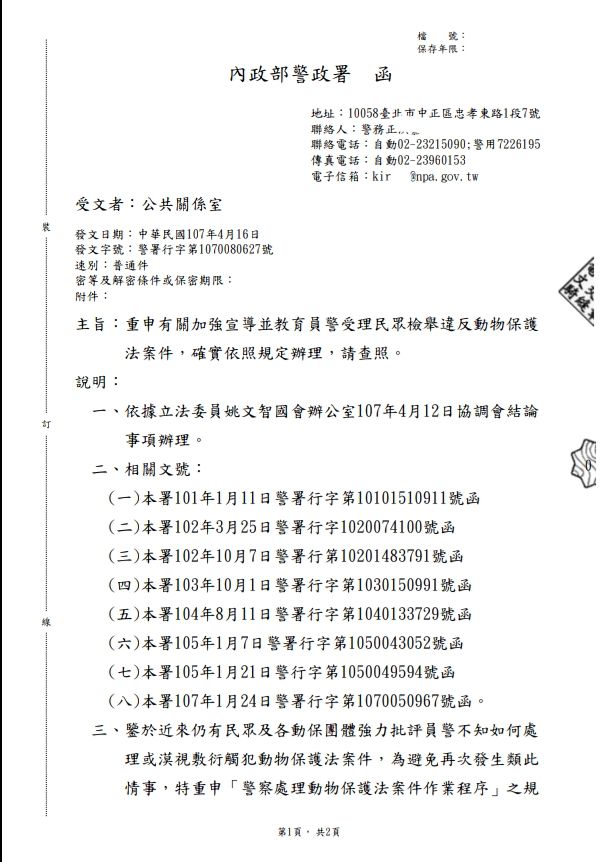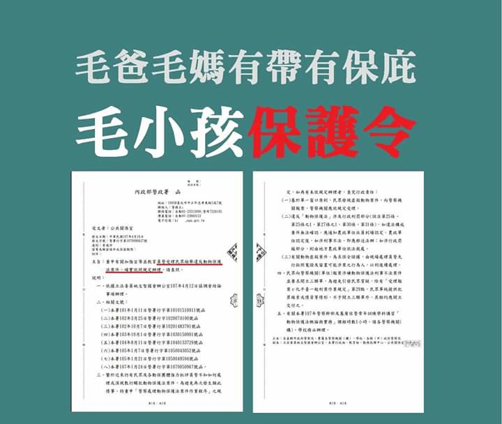 公聽會上,警政署認為動保並非其主管業務,仍欲推拖。最後,在姚文智委員的堅持下,警政署終於訂出「動保警察協助處理動物案件處理流程」,明訂各警局、派出所不得拒絕受理動保案,且必須開具三聯單。這「動保警察協助處理動物案件處理流程」我們稱他為「毛小孩保護令」。